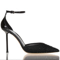 Questa décolleté è un mix perfetto di sensualità e raffinatezza. La tomaia in mesh nero, impreziosita da applicazioni di strass tono su tono, dona luminosità e carattere al design. La punta affusolata slancia la silhouette, mentre il cinturino alla caviglia assicura una calzata elegante e stabile. Il tacco a stiletto alto completa il modello con un’allure sofisticata e audace. Perfetto per look serali ed eventi esclusivi, è la scarpa ideale per distinguersi con charme e personalità. Decollete' in vernice con cinturino alla caviglia e punta in rete ricoperta di strass. Scollo a punta. Suola in cuoio, tacco laccato 10,5 cm.