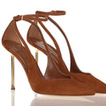 Questo decollete' Ninalilou in morbido camoscio color cuoio è un connubio perfetto tra femminilità ed eleganza contemporanea. La silhouette affusolata con punta slanciata valorizza la figura, mentre il sottile cinturino alla caviglia avvolge il piede con delicatezza, garantendo stabilità e charme. Il tacco Helen dorato, slanciato e raffinato, illumina il design con un tocco sofisticato e moderno. Ideale per look da sera o occasioni speciali, è la scelta perfetta per chi desidera distinguersi con stile e raffinatezza. Decollete' in camoscio con cinturino alla caviglia. Suola in cuoio. Tacco cromato 10,5 cm.
