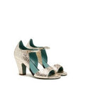 Scarpa con tacco in pelle laminata effetto metallico con cinturino alla caviglia e suola in cuoio. Tacco 70.