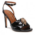 Grintoso sandalo in pelle verniciata nera con effetto trapuntato e cinturino a caviglia. Presenta logo iconico in oro brunito. tacco 10 cm.