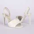 Grintoso sandalo in pelle bianca effetto trapuntato. Presenta un cinturino a caviglia e logo iconico bianco nella parte centrale. tacco 10cm.