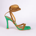 Sandalo con stringhe a caviglia in pelle scamosciata nei colori marrone e verde. Tacco squadrato 9 cm.