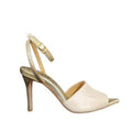 Particolare sandalo in pelle con una fascia che abbraccia il piede in pelle scamosciata. Presenta un cinturino che fascia la caviglia e si incrocia al tallone. Tacco 9,5 cm.