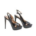 Sandalo in pelle nera con fasce incrociate che avvolgono il piede, comodo plateau di 2 cm e tacco a spillo di 10 cm.