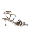 Pratico e chic sandalo in pelle laminata argento con fasce avvolgenti e comodo tacco di 6 cm.