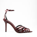 Sandalo in morbida pelle verniciata in coloro rosso, con particolare design a punta e stringhe che si incrociano e abbracciano il piede. 9,5 cm.