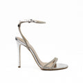 Un sandalo adatto alle cerimonie in pelle specchiata argento. Presenta due fasce ricoperte di strass e incrocio del cinturino sul retro con chiusura a caviglia. Tacco a stiletto 10 cm.