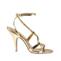 Sandalo in morbida pelle laminata oro,con stiscette che abbracciano il piede. Cinturino a caviglia e tacco 10 cm.