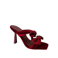 Elegante e sofisticato sandalo in velluto rosso con fiocchetti e strass tono su tono. Presenta una punta squadrata e un tacco di 10 cm.