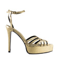 Un sandalo grintoso e particolare, in morbida pelle laminata color oro; presenta delle stringhe sottili che abbracciano il piede , un comodo plateau e una punta decisa che la rende unica.