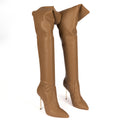Stivale a calza in morbida pelle elasticizzata color noce; altezza sopra al ginocchio,renderà i vostri outfit ancora più esclusivi. Punta affusolata,tacco a stiletto oro 10.5cm.