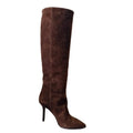 Stivale alto al polpaccio in morbida pelle scamosciata in un bellissimo color testa di moro. Presenta una punta affusolata e un tacco a spillo di 10 cm.