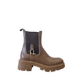 Comodo e pratico in morbida pelle color toupe con inserti laterali elastcizzati color ambra. Presenta una placchetta in oro brunito sulla parte laterale e una suola in gomma effetto carro armato.