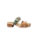 Lo zoccolo aperto di Paola D'Arcano presenta un incrocio in pelle cuoio arricchito da una fascia in pelle laminata verde , con fibbia in oro chiaro fondo in legno.